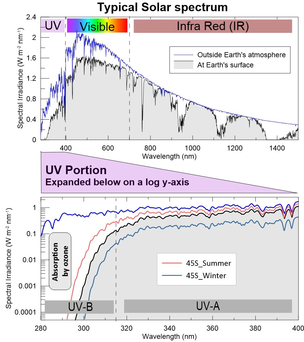 Also shown in the lower plot are two spectra measured near my home in New Zealand, at NIWA’s Lauder atmospheric research laboratory (45 S, 170 E, alt. 370 m). They are typical for noon on clear days close to the summer and winter solstices. The detailed structure that’s apparent - especially in the UV-A region of the measured spectra - is exactly as expected. But, unlike the ET spectrum, all three spectra at Earth’s surface plummet at shorter UV-B wavelengths. You can see that at 300 nm, the contribution in summer is about 200 times larger than in winter, and that ratio becomes larger at shorter wavelengths and smaller at longer wavelengths.