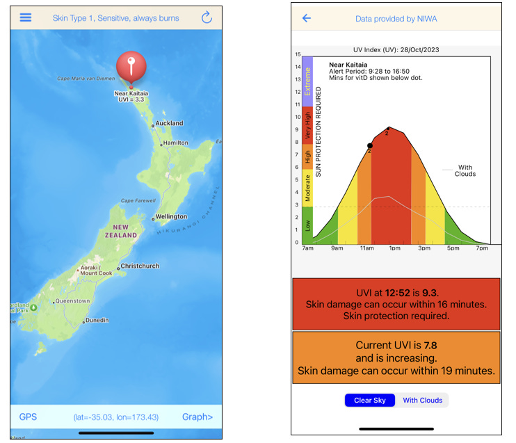 Measurements like these are available at only a few sites and not everybody lives at those sites. But that’s OK. Similar plots can be read from the UVNZ smartphone app that my colleague, Jerry Burke, and I developed. They also include the recommended behavioural advice – dependent on your selected skin type - for exposures to sunlight at any time of the day.